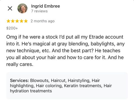 - Expert Techniques: Utilizing advanced grey blending techniques and high-quality products, Aric ensures even tones and a harmonious blend, enhancing the overall appearance. Aric also includes olaplex and collagen treatments in the process during your appointment.